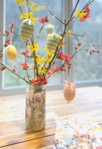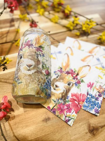 V Sparu imajo res velik, skoraj pravljičen izbor servietkov z velikonočno tematiko, od živahnih do nežnih barv in vzorcev. Sama sem izbrala velikonočnega zajca, obdanega s travniškimi cvetlicami. Prav ta servietek je naši najstnici služil kot osnova za lepo in unikatno velikonočno vazo.