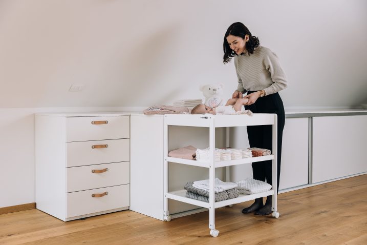 Previjalni kotiček je tisti del sobice, kjer se boste znašli nemalokrat v dnevu. Previjanje, preoblačenje in umirjanje, morda sproščujoča masaža pred spanjem. Precej staršev izbere klasične lesene komode s previjalno površino, spet drugim pa so bližje zložljive rešitve, ki so praktične predvsem v manjših stanovanjih. Ne glede na izbiro je ključno, da je vse na dosegu roke in da prostor omogoča mirno, tekočo rutino, brez iskanja in brez nepotrebne naglice.