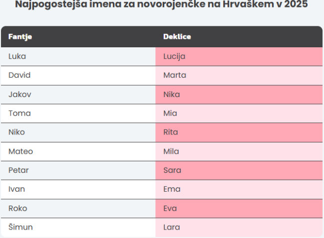 Starši na Hrvaškem ostajajo tudi v letu 2025 zvesti tradicionalnim in klasičnim imenom.